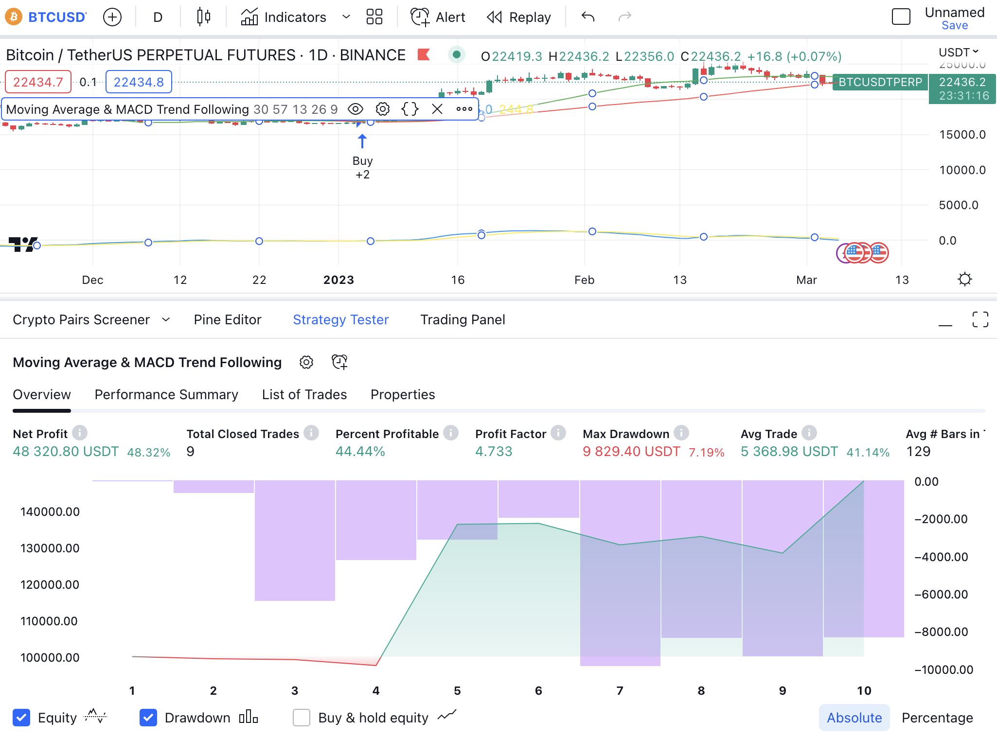 BTCUSDT交易对杠杆为10倍,数量为0.002个比特币。 - 在TradingView 下方